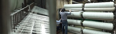 ・この糸を紡織機で織り上げて反物にし、表面を起毛させ毛先を揃えます。