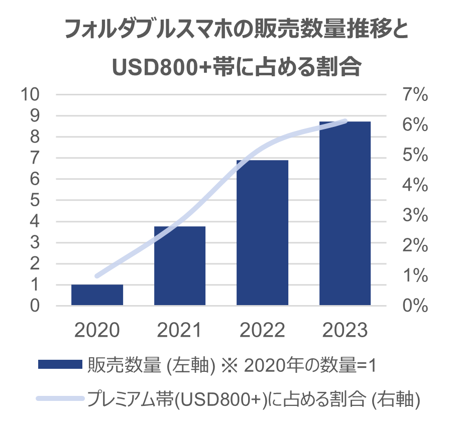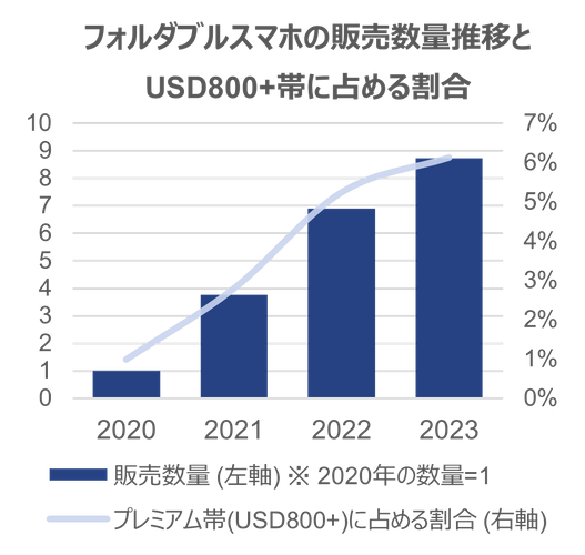 ほとんどのモデルがプレミアム価格帯(USD800+)で販売され、この価格帯の伸びにもつながっている。このような継続的な伸びによりプレミアム価格帯の販売数量におけるフォルダブル端末の2023年の割合は6%だった。