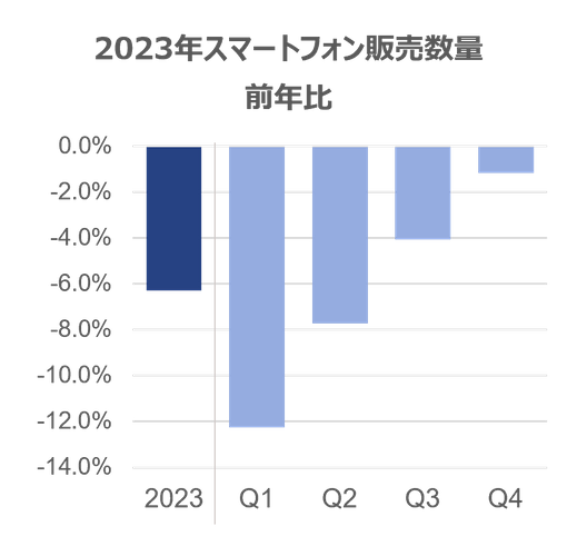 ・ 2023年の世界スマートフォン販売数量は前年比6%減と低調。四半期を通じて前年比減が続いた。