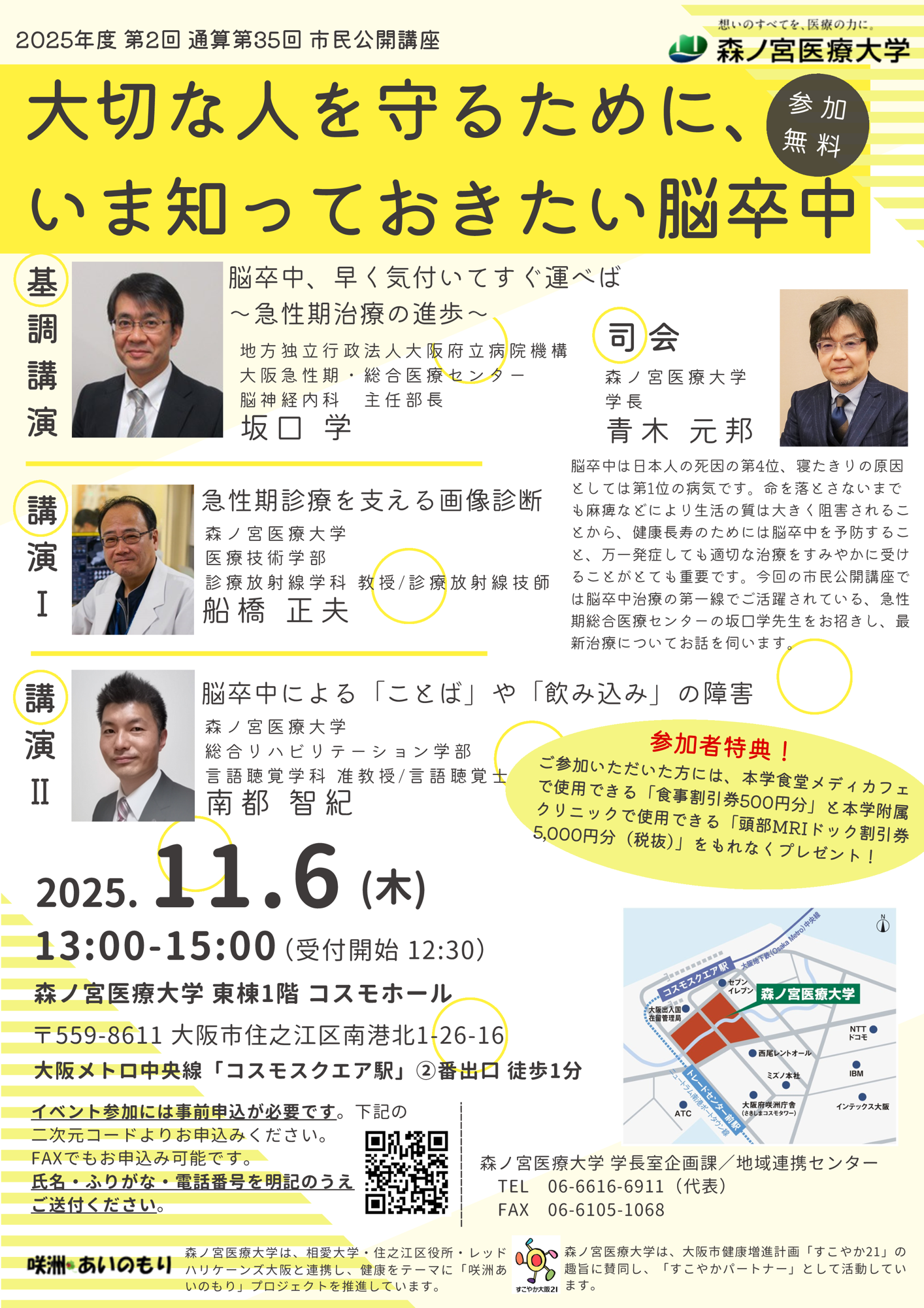 森ノ宮医療大学(大阪市住之江区、学長:青木元邦)は、11月6日(木)に2025年度第2回市民公開講座を開催します。今回は、日本人の死因の第4位、寝たきりの原因としては第1位の病気といわれている「脳卒中」をテーマとし、大阪急性期・総合医療センターの専門医をお招きしてお話を伺います。また、急性期の診療を支えている画像診断、脳卒中により起こる言語障害などについて、本学診療放射線学科、言語聴覚学科の教員が詳しく分かりやすくお伝えする予定です。是非ご参加ください。皆様のご来場をお待ちしております。
