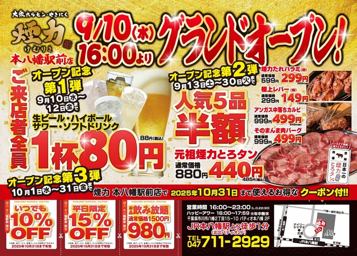 株式会社VISION MEAT WORKSは、2025年9月10日(水)に関東出店4号店となる大衆ホルモン・やきにく煙力(けむりき)本八幡駅前店をオープンいたします。煙力は名古屋から全国への展開が進む焼肉店であり、昨今の大衆焼肉ブームの先駆けとなった業態です。