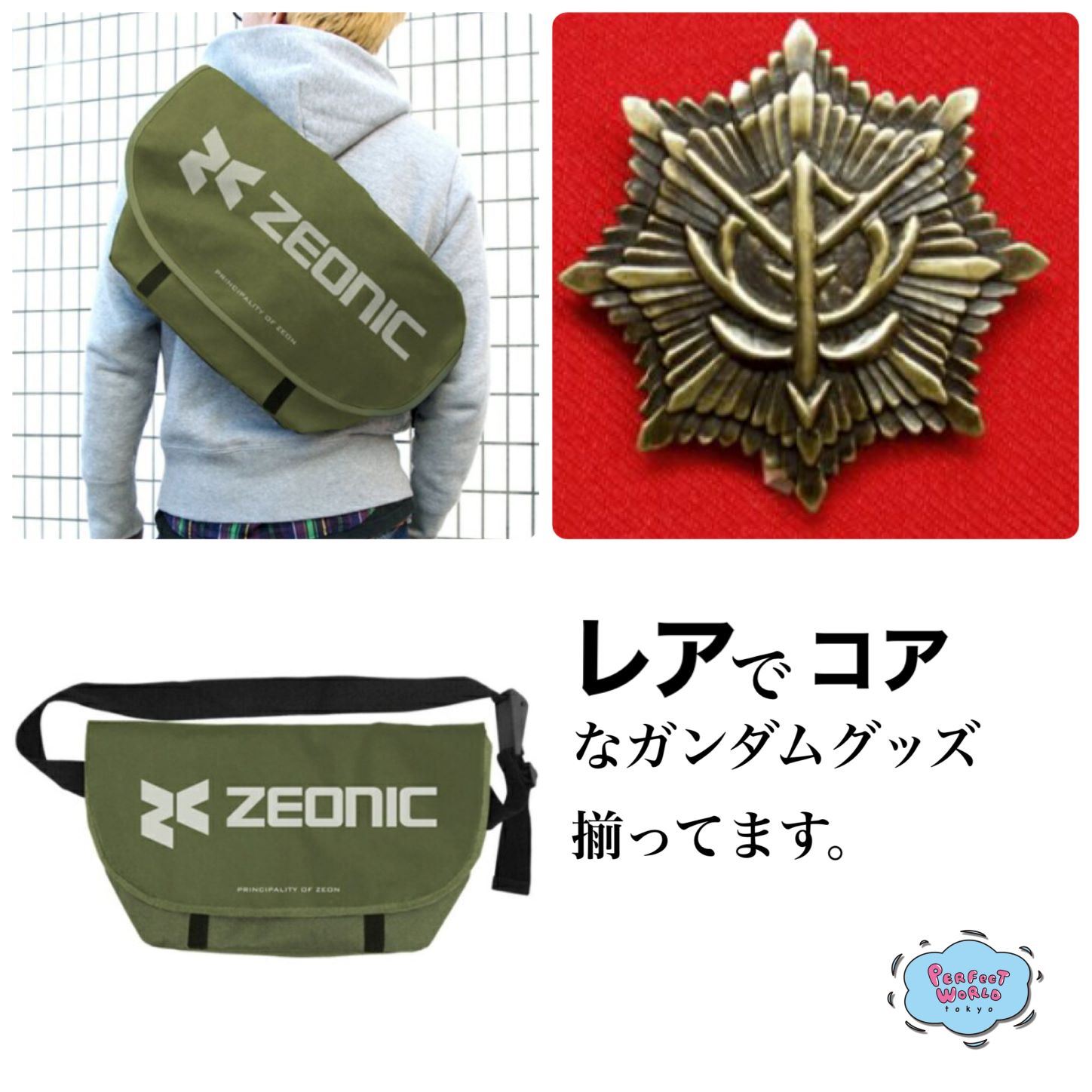 ジオニック社デザインのバッグやジオン勲功大章バッジなどレアでコアなガンダムグッズ揃ってます。