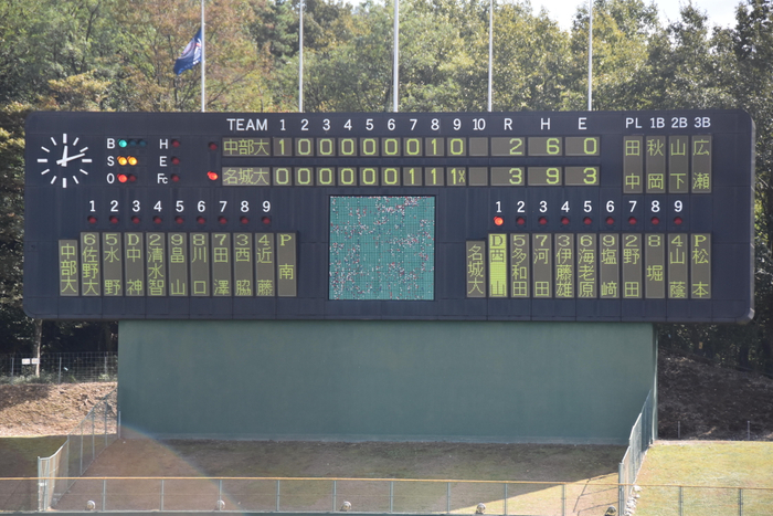 しかし、8回表にワイルドピッチで勝ち越され、またも追う展開。諦めない名城打線は8回裏、レフトオーバーを放った3番・河田隆博選手(法学部4年)を二塁に置き、4番キャプテンの伊藤雄紀選手(法学部4年)が右前タイムリーで再び同点。9回表には気迫あふれる松本投手が、2つの三振を奪い、流れを引き寄せます。