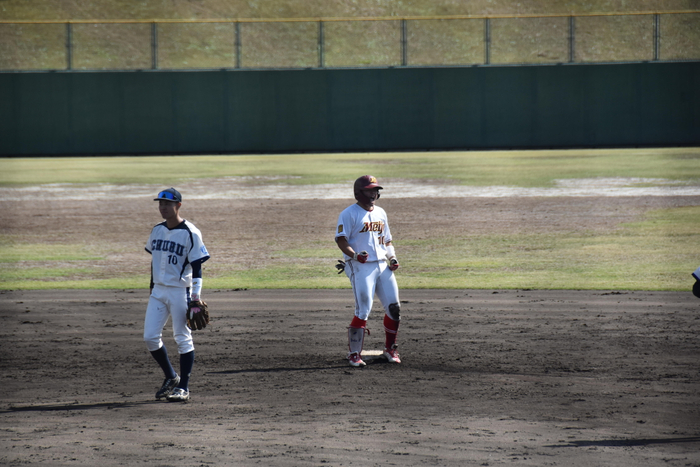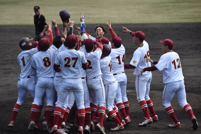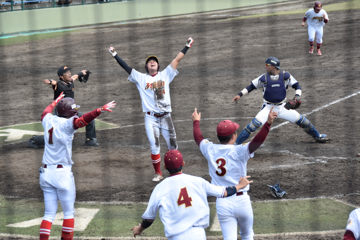 そして迎えた9回裏、先頭の塩崎選手がライト前ヒットで出塁し、四球を挟んで、山蔭一颯選手(法学部2年)もセンター前へ。1死満塁のチャンスで1番・西山慶選手(経済学部2年)の内野安打で塩崎選手が返り、激闘に終止符を打ちました。