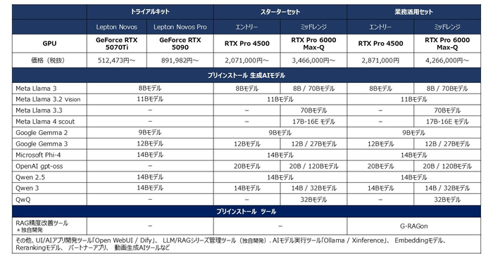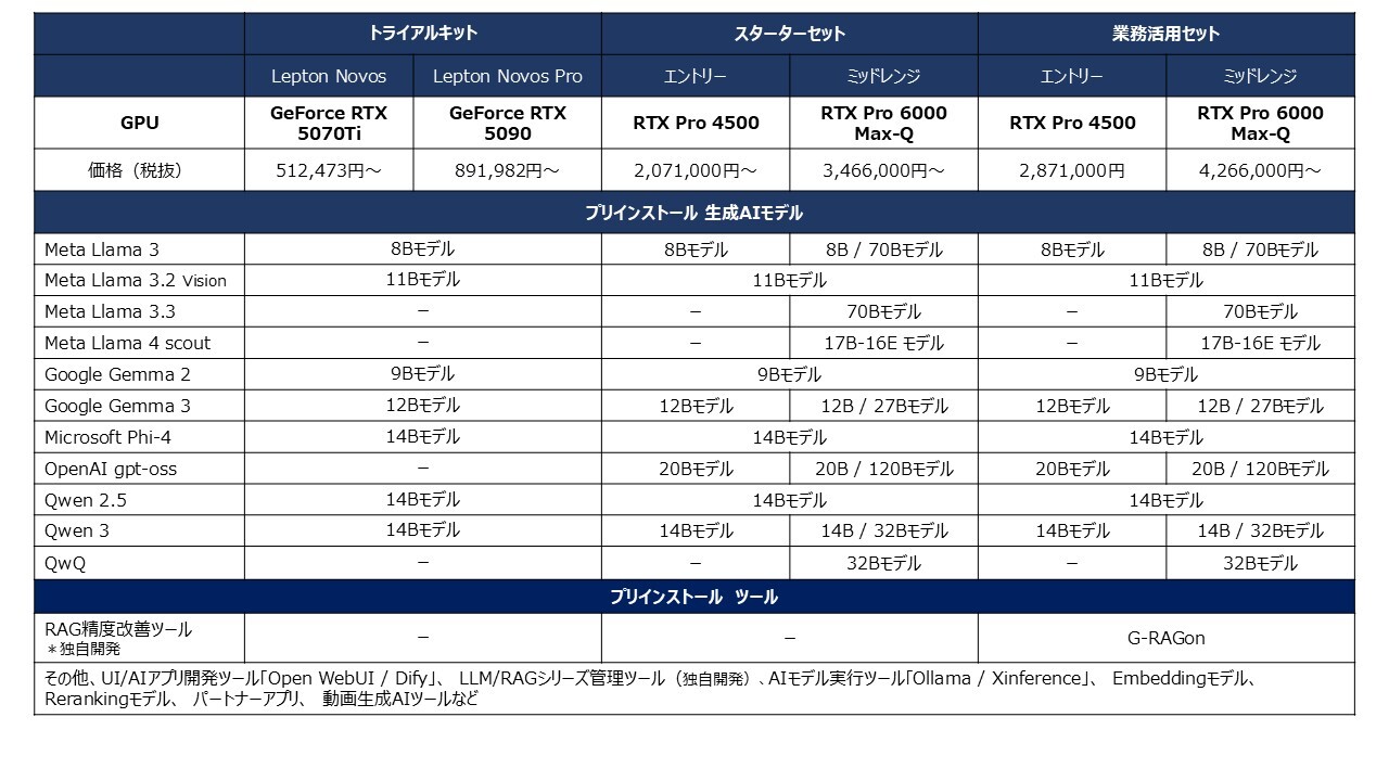 それぞれの製品は、LlamaやGemmaなどのLLMモデルやRAG開発ツール「Dify」がプリインストールされており、届いたその日からすぐにLLM/RAG開発を始められます。