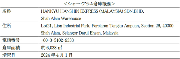 阪急阪神エクスプレス(本社:大阪市北区 代表取締役社長:谷村 和宏)のマレーシア法人であるHANKYU HANSHIN EXPRESS (MALAYSIA) SDN.BHD.(本社:クアラルンプール)は、クアラルンプール近郊の既存倉庫であるシャー・アラム倉庫を4月1日より増床しました。同倉庫のある工業団地はポートクラン港から30km、クアラルンプール国際空港から45kmの好立地に位置しています。