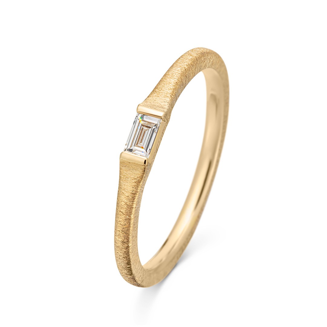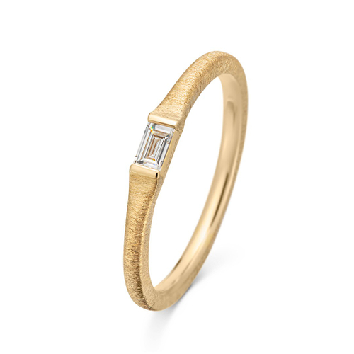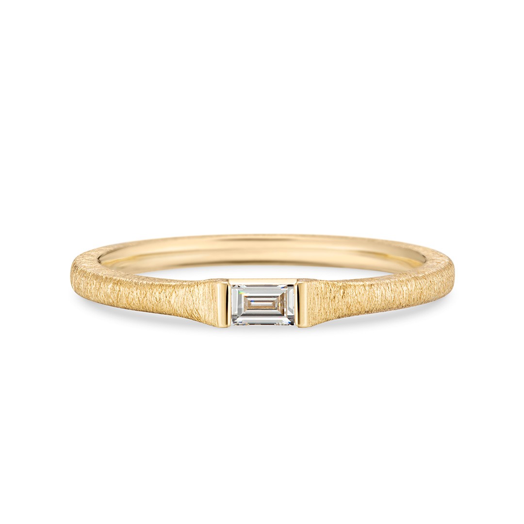 センターにバゲットカットのダイヤモンドが輝くリング。直線的なカットが凛とした気品ある印象。アームには“ラフライン”という繊細なテクスチャをほどこし、カジュアルな装いにもマッチします。ダイヤモンドとアーム幅の差が大きくないことから、細身の他のリングとの重ね着けも楽しめるデザインです。