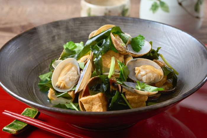 おひとり様用のお鍋で堪能できる、磯の香豊かなお鍋。鳴門わかめの歯ごたえと風味の良さ、あさりの滋味深い味わいをお楽しみください。