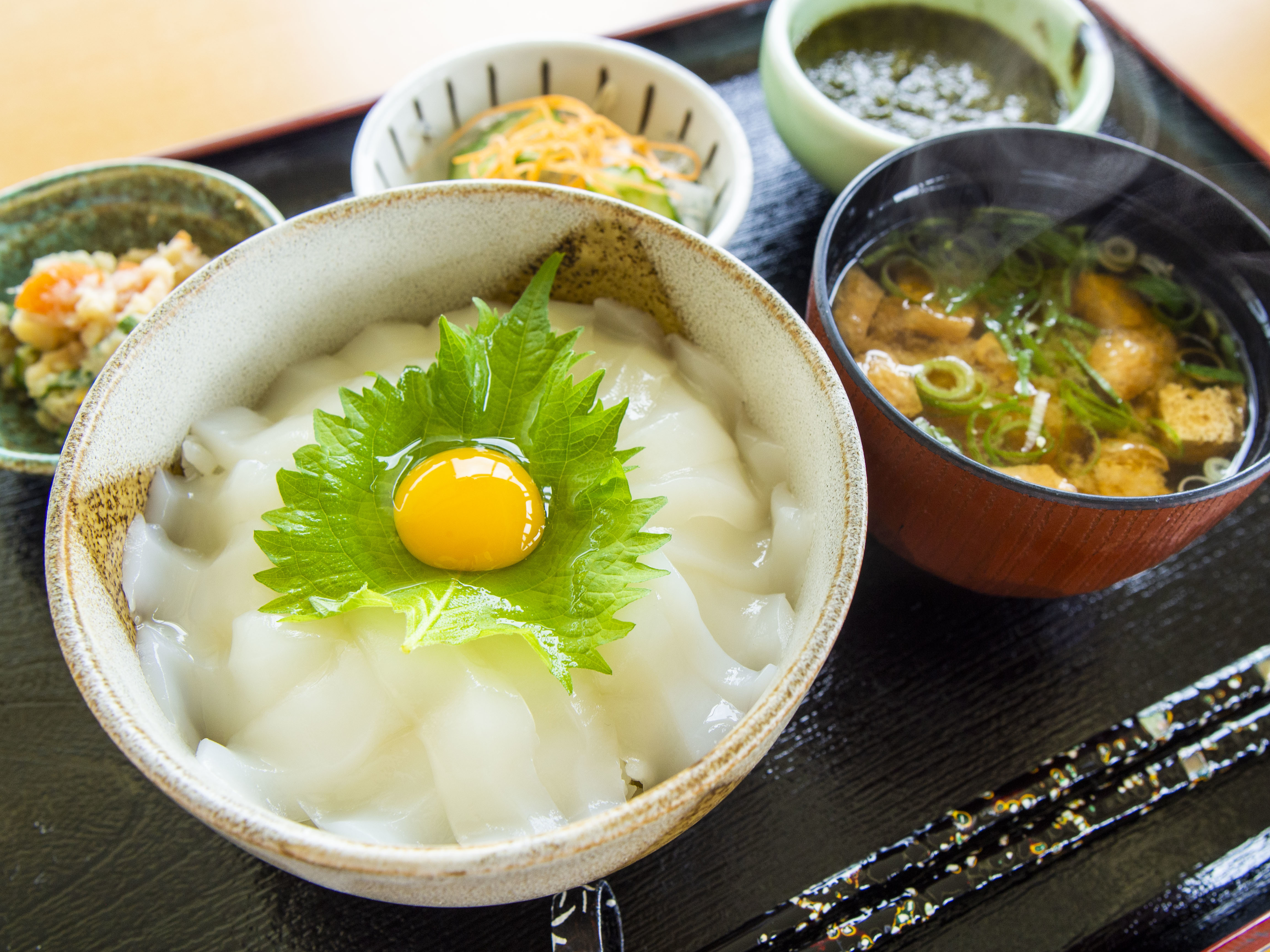 この季節のイカを丼にし、さらに、最近健康食品として注目が高まっている海藻「アカモク」のねばねば・シャキシャキ食感のタレをかけてお召し上がりいただけます。
