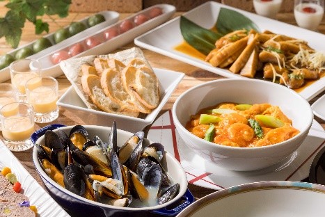 ・ スモークサーモンのミルクレープ、ディルとケイパー風味 ・プロヴァンス風パテ、コンディマン色々添え・丸鶏仕込みの棒棒鶏 ・ブルターニュ風ムール貝のマリニエール ・ケサディーヤ ・中華風小海老のマヨネーズ和え ・ガーリックメルバトースト・トマトのコールドスープ ・フレンチオニオンスープ
