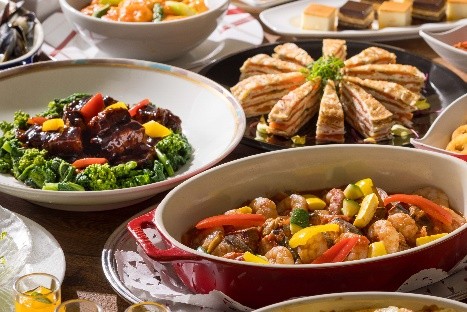 当ホテルでは、ご家族やご親戚でのお食事の機会が増えるゴールデンウィークに合わせ、世代を超えてお楽しみいただける“ファミリー向けビュッフェ”を企画しました。注目は、シェフが目の前で焼き上げる「ミニッツステーキ」です。ジューシーでやわらかく、食べやすいサイズ感に仕上げた「ミニッツステーキ」は、思わずおかわりがしたくなる一品です。「ビーフグレイビー」、「ポン酢おろし柚子風味」、「ディアブルソース」の3種のこだわりソースを添えて、お好みの味でお召し上がりください。その他にも、スモークサーモンとクリームチーズを重ね合わせた「スモークサーモンのミルクレープ」や、魚介の優しい味わいが広がる「トスカーナ風 魚介の軽い煮込み“カッチュッコ”」、黒酢のコクと程よい酸味があとを引く「黒酢の酢豚 吉祥ダイニングスタイル」など、バラエティ豊富なメニューがずらりと並びます。