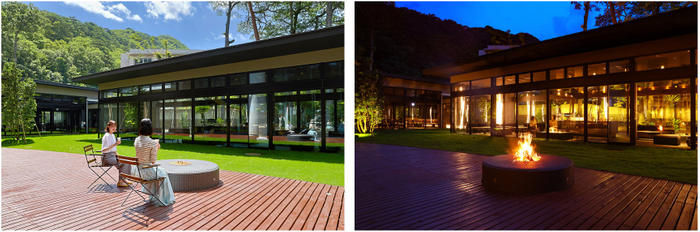 本物の薪をくべるファイヤーピットを中心に、日中はもちろん満天の星空を眺める夜もお客様が集う空間です。