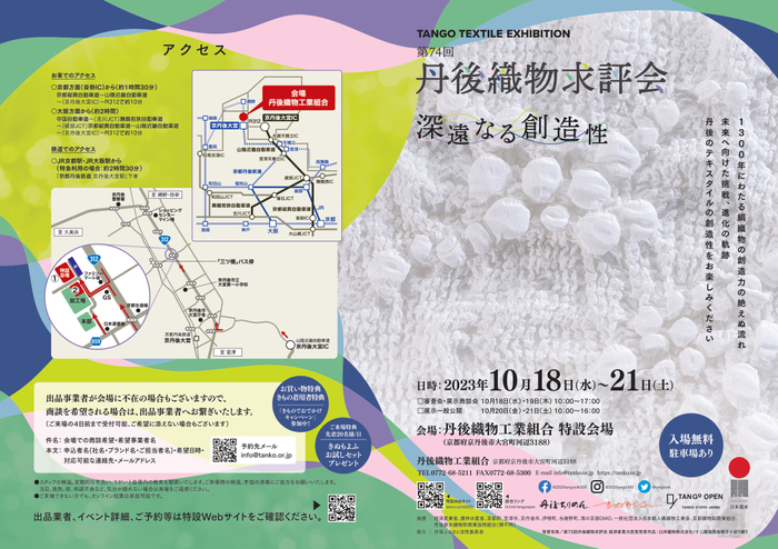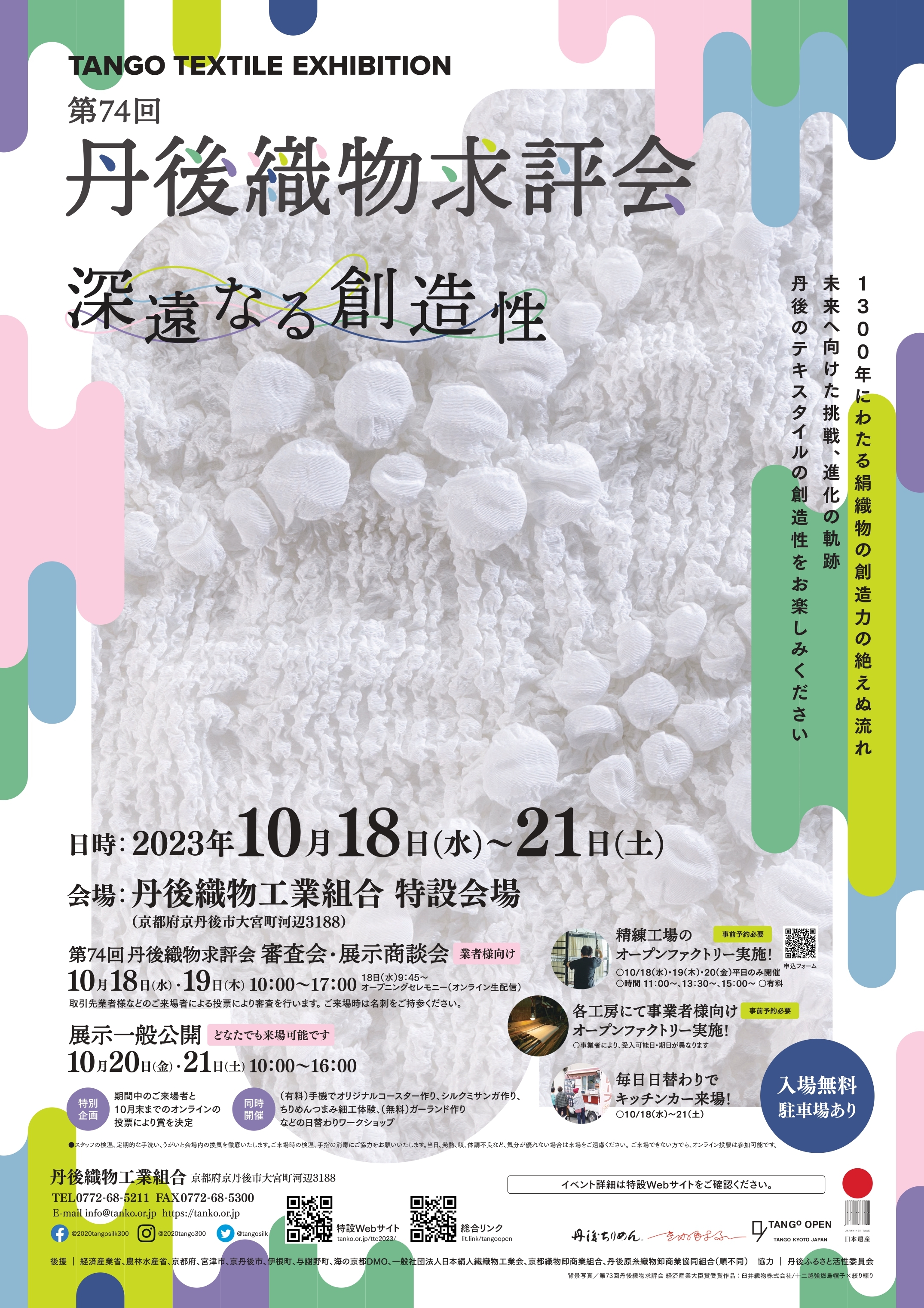 丹後織物工業組合(所在地:京都府京丹後市)は、『TANGO TEXTILE EXHIBITION/第74回丹後織物求評会』を2023年10月18日(水)から10月21日(土)まで丹後織物工業組合特設会場にて開催いたします。