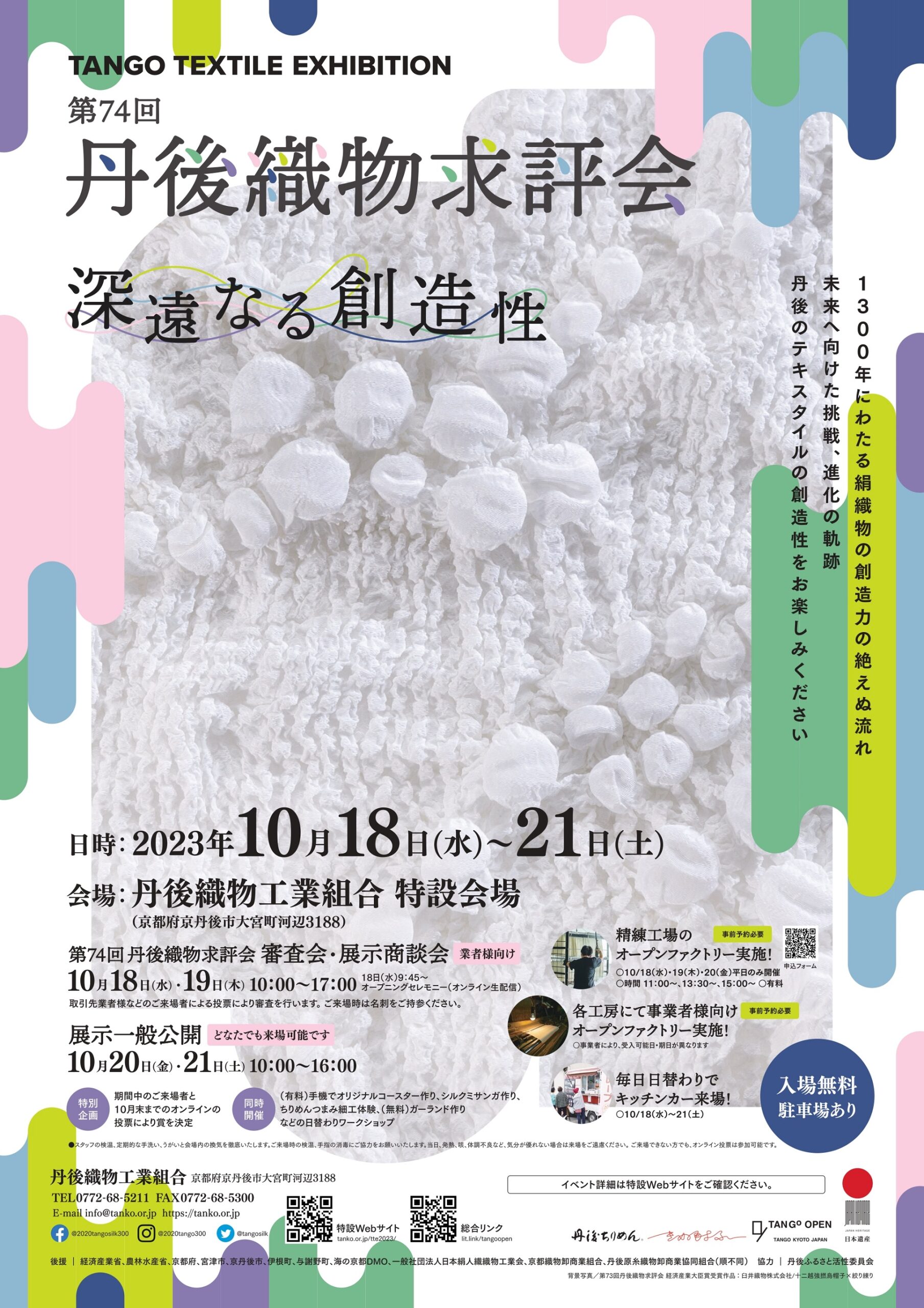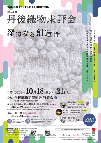 10月18日(水)~21日(土)に亘り、『TANGO TEXTILE EXHIBITION/第74回丹後織物求評会』開催いたします。本年は「-深遠なる創造性-」をテーマとし、伝統ある丹後産地で織り継がれた匠の技の粋を集め、斬新かつ創造性に富む作品の数々を提案いたします。