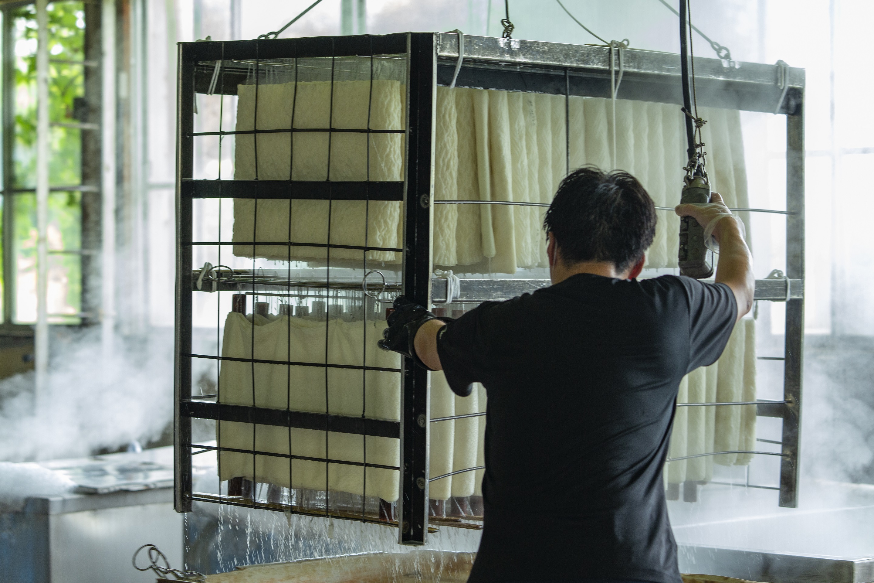 組合では、皆様に安心してご利用いただけるよう、選び抜かれた丹後ちりめんの生地のみを使用し、専用の精練槽(せいれんそう)で薬品を一切使用しない特別な方法にて上質の絹セリシンを抽出しています。