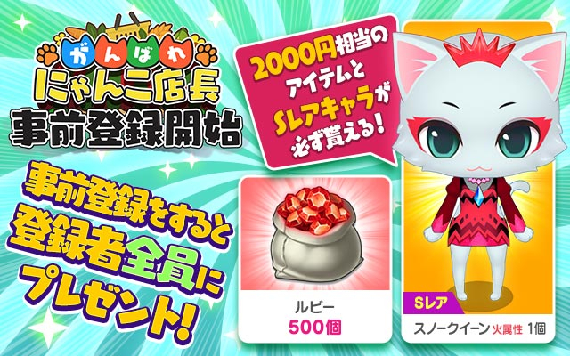 事前登録者全員 : ルビー500個、Sレアキャラ「スノークイーン(火属性)」