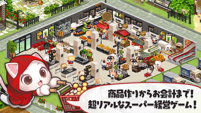 『がんばれ!にゃんこ店長』は、可愛いにゃんこたちの世界で楽しめる、まったり農場ライフ × スーパー経営シミュレーションゲームです。