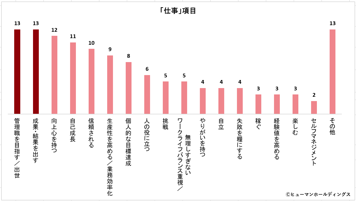 「人生目標」を達成するために必要な8大分野の各項目の中で一様の傾向があったのは「仕事」の項目で、【管理職を目指す/出世】系目標が13名、【成果・結果を出す】系目標が13名で同率1位でした。