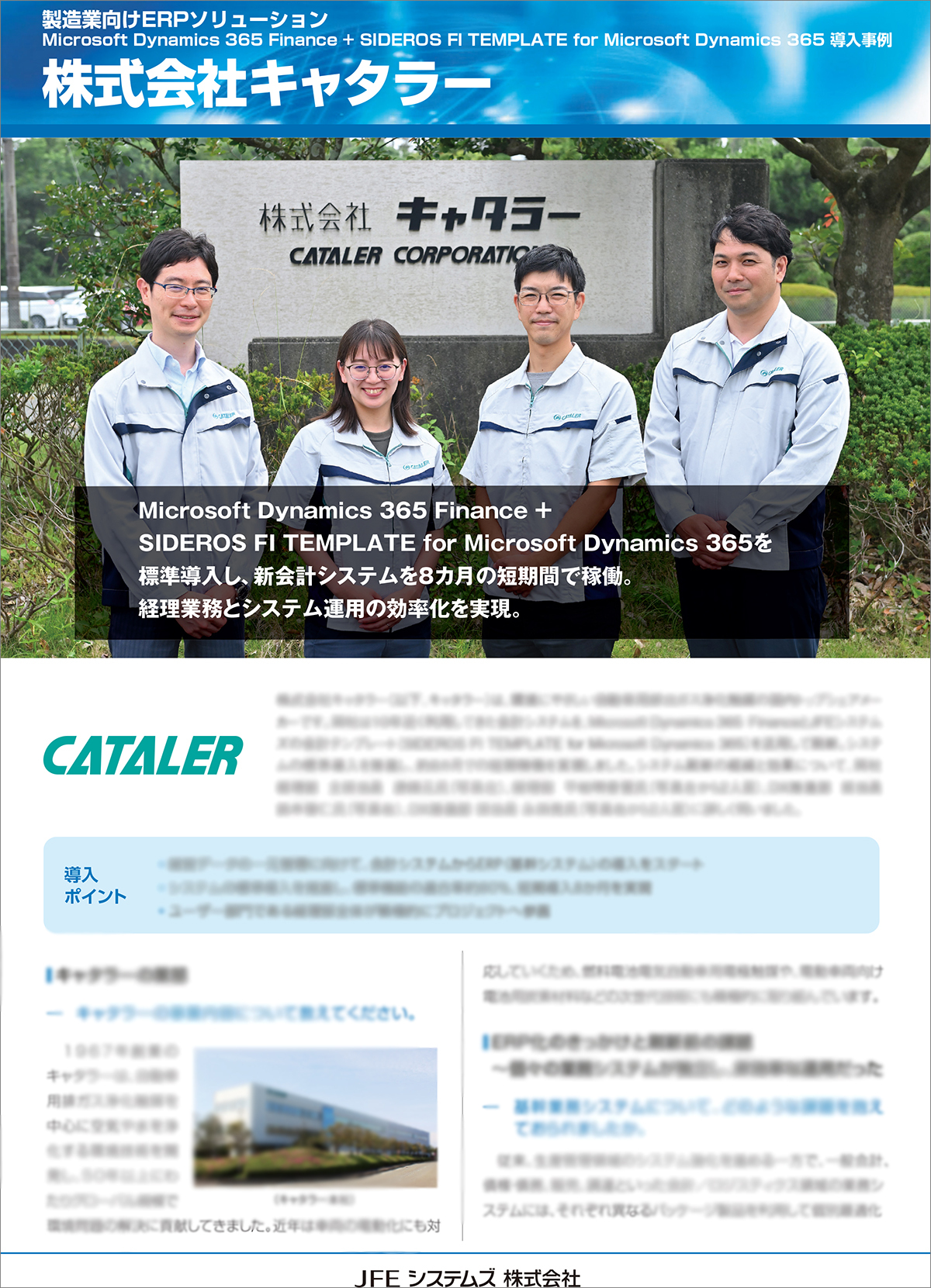 JFEシステムズ株式会社(東証スタンダード市場 4832、本社:東京都港区、代表取締役社長:大木 哲夫、以下 JFEシステムズ)は、株式会社キャタラー(本社:静岡県掛川市、代表取締役社長:石田 雅資、以下 キャタラー様)が、JFEシステムズ製の会計テンプレート「SIDEROS(R) FI TEMPLATE for Microsoft Dynamics 365」を活用した標準導入を推進し、Microsoft社のグローバルERP「Microsoft Dynamics 365 Finance」を8カ月の短期間で導入したことをお知らせします。