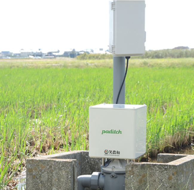 スマート水田サービス「paditch(パディッチ)」は、農作業工程で一番時間と労力を使う水管理工程を遠隔操作、自動制御化した製品で、スマートフォンのボタン一つで水門や給水栓の開閉を一括で行うことができるシステムです。