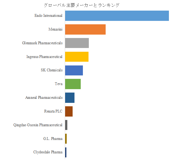 本市場は少数企業による寡占構造を特徴とし、2024年時点で上位5社が約75%の市場シェアを占める。主要企業には Endo International、Menarini、Glenmark Pharmaceuticals、Ingenus Pharmaceutical、SK Chemicals、Teva、Amneal Pharmaceuticals、Renata PLC、Qingdao Guoxin Pharmaceutical、G.L. Pharma などが並ぶ。国際的品質基準に対応した製造体制をもつ企業が中心であり、信頼性と供給安定性が市場支配力の源泉となっている。新規参入には技術・認証面の壁が存在し、今後も既存リーダー企業が優位を保つ構造が続くとみられる。