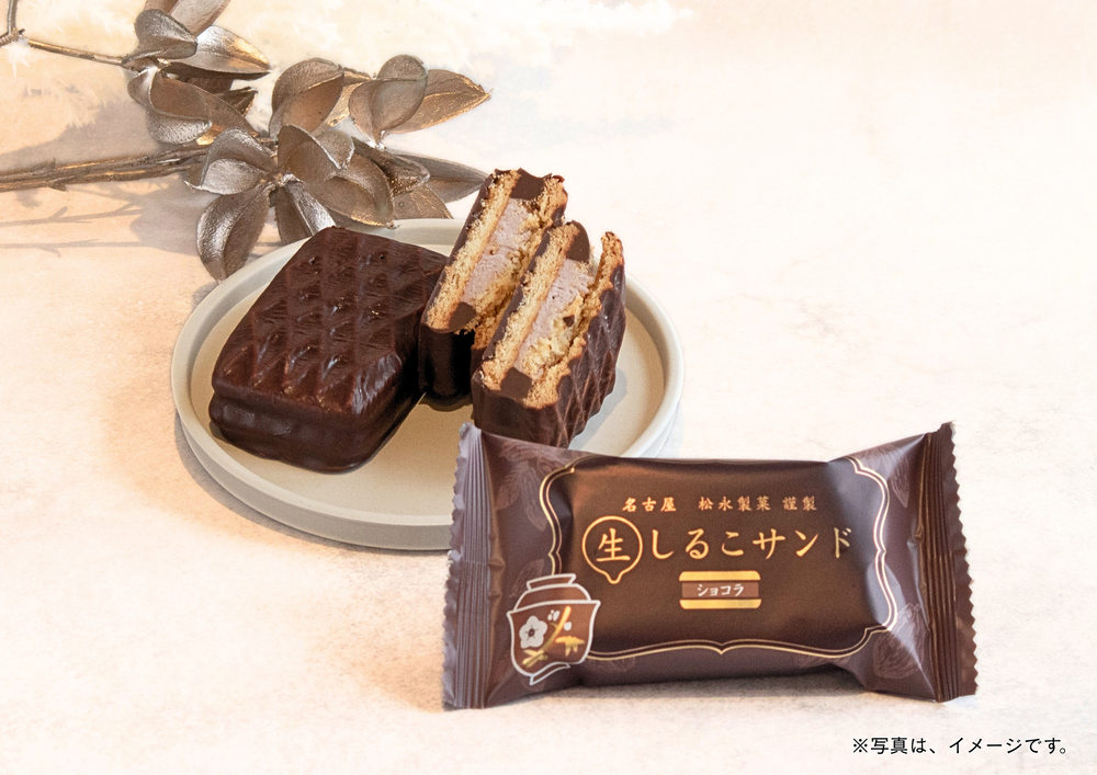 2025年で発売10周年を迎えるしるこサンドの高級版「生しるこサンド」の季節限定フレーバー「生しるこサンドショコラ」は、しっとりとしたビスケットにあんこクリームをサンドし、濃厚なチョコレートで包み込んだ新感覚和洋折衷スイーツです。