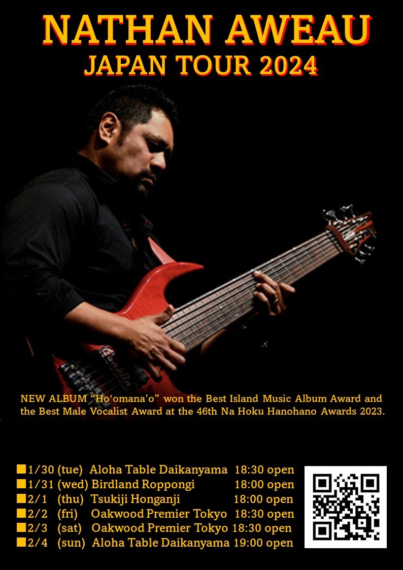 NATHAN AWEAUは、ニューアルバム「Ho'omana'o」で、ハワイのグラミー賞とも称される最高峰の音楽祭「ナ・ホク・ハノハノ・アワード」で最優秀アイランドミュージック・アルバム賞、最優秀男性ボーカリスト賞の2部門を受賞。アルバムの日本発売を記念して、ジャパンツアーを開催。2024年1月27日(土)浜松市地域情報センター(静岡・浜松)公演を皮切りに、全国で全8公演の開催となります。