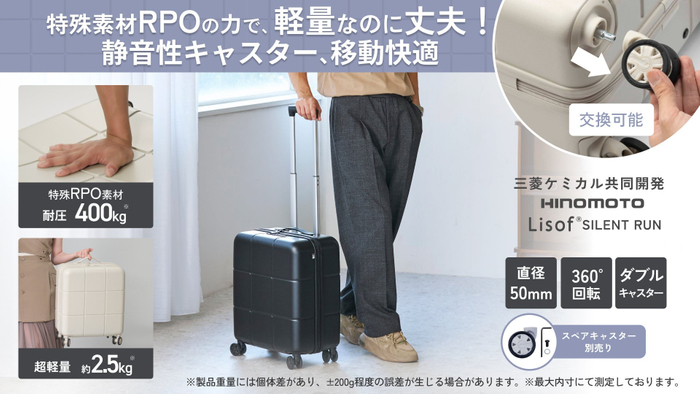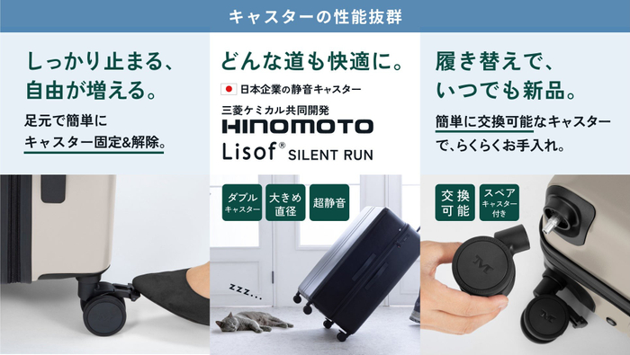 HINOMOTOと三菱ケミカルが共同開発した「SILENT RUN」キャスターを採用し、静かで滑らかな走行を実現。さらにスペアキャスターを1個付属しているため、予期せぬトラブル時にも安心です。