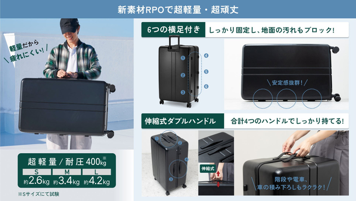 軽量で高強度を誇る新素材RPOを採用し、柔軟性と復元力に優れたボディを実現。衝撃に強く、長距離移動も安心です。業界トップクラスの軽さ約5.6kgで、約151Lの大容量を両立。留学や家族旅行、出張、スポーツ遠征など、荷物の多いシーンに対応します。かさばる衣類や大型道具も余裕で収納可能です。また、底面6点横足により安定性と汚れ防止を確保。トップとサイドのダブルハンドルで持ち運びやすさにも配慮しています。