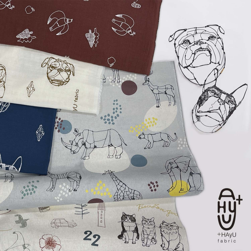 ワイヤーアート作家・小川 学氏の世界観をテキスタイルに。一本のワイヤーから生まれる動物や植物のラインを、そのまま布地に表現しています。シンプルながらも空間にリズムを生むデザインは、インテリアからファッションまで幅広いシーンで愛されています。