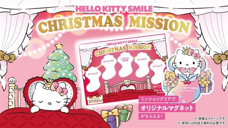 内容: HELLO KITTY SMILEの5つのエリア内にいるスタッフに合言葉「メリークリスマス」をお伝えいただくと限定ステッカーをお渡しします。全5種類の限定ステッカーを全て集めると、本イベント限定デザインのマグネットをプレゼント ※無くなり次第終了