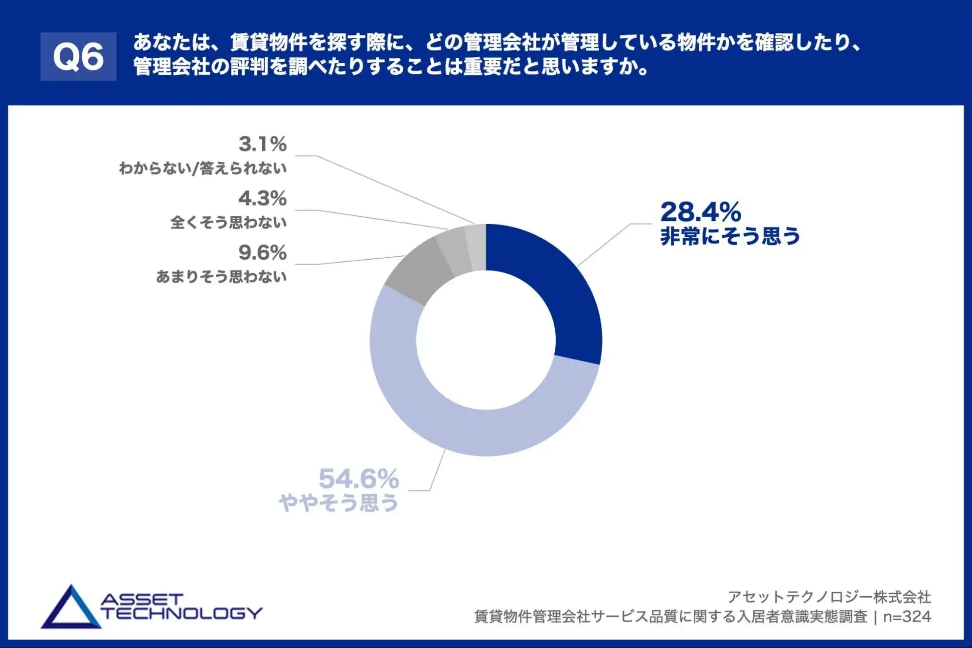 「Q6. あなたは、賃貸物件を探す際に、どの管理会社が管理している物件かを確認したり、管理会社の評判を調べたりすることは重要だと思いますか。」(n=324)と質問したところ、「非常にそう思う」が28.4%、「ややそう思う」が54.6%という回答となりました。
