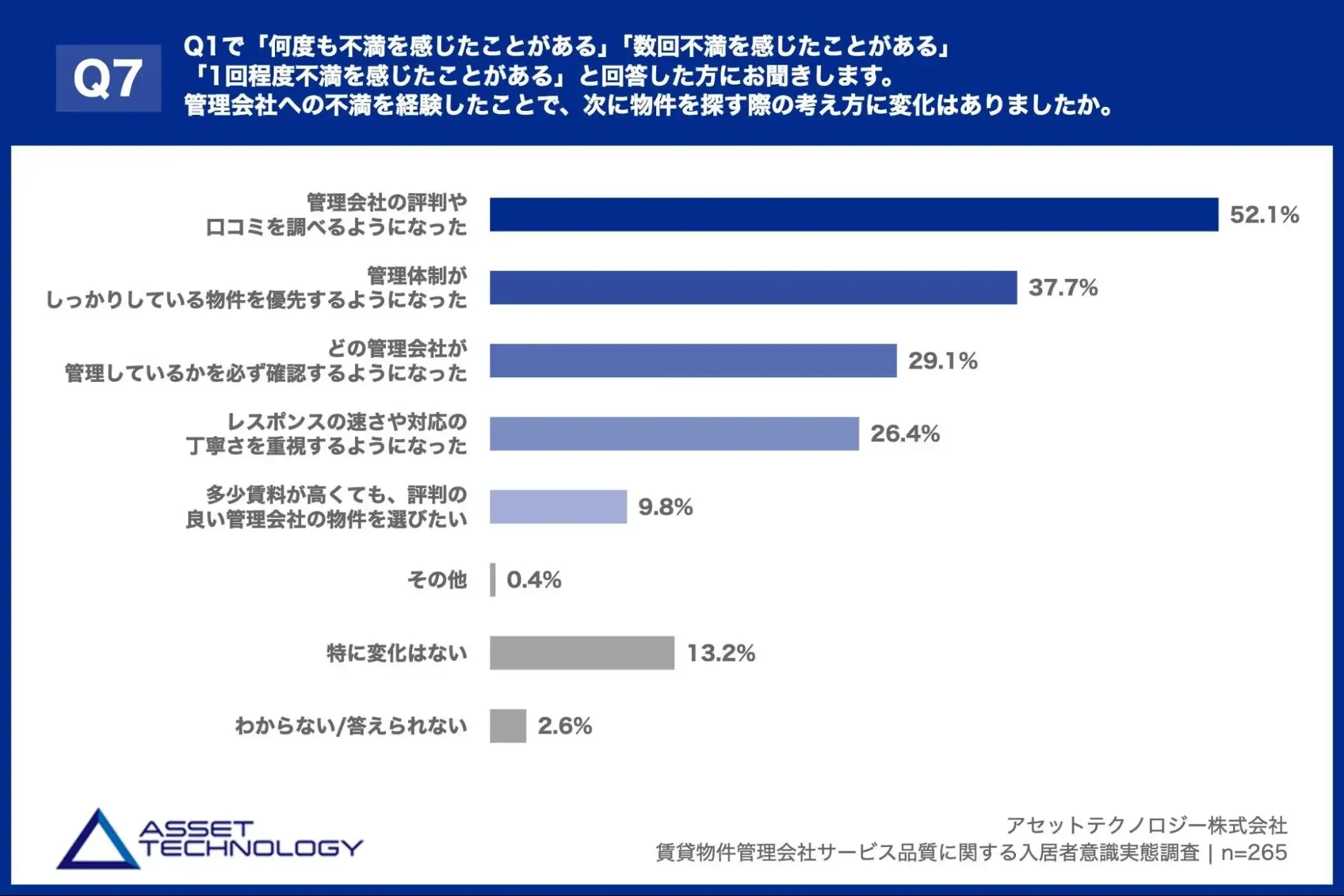 「Q7. Q1で「何度も不満を感じたことがある」「数回不満を感じたことがある」「1回程度不満を感じたことがある」と回答した方にお聞きします。管理会社への不満を経験したことで、次に物件を探す際の考え方に変化はありましたか。(複数回答)」(n=265)と質問したところ、「管理会社の評判や口コミを調べるようになった」が52.1%、「管理体制がしっかりしている物件を優先するようになった」が37.7%、「どの管理会社が管理しているかを必ず確認するようになった」が29.1%という回答となりました。