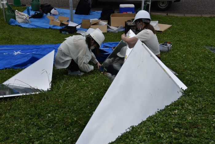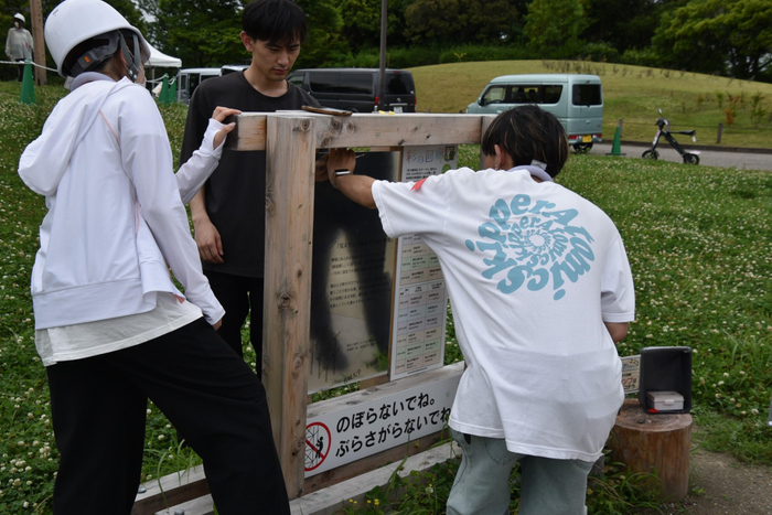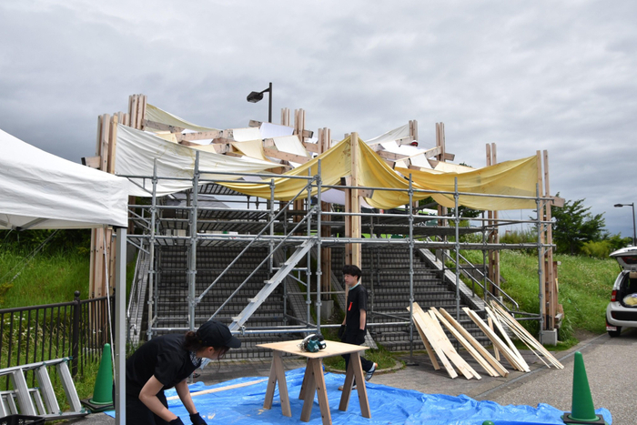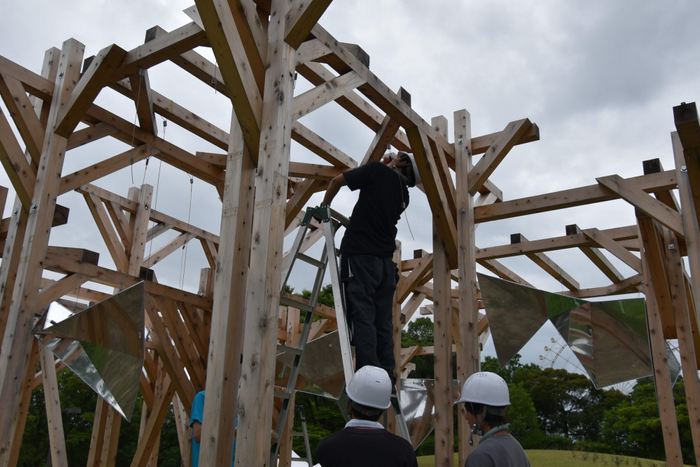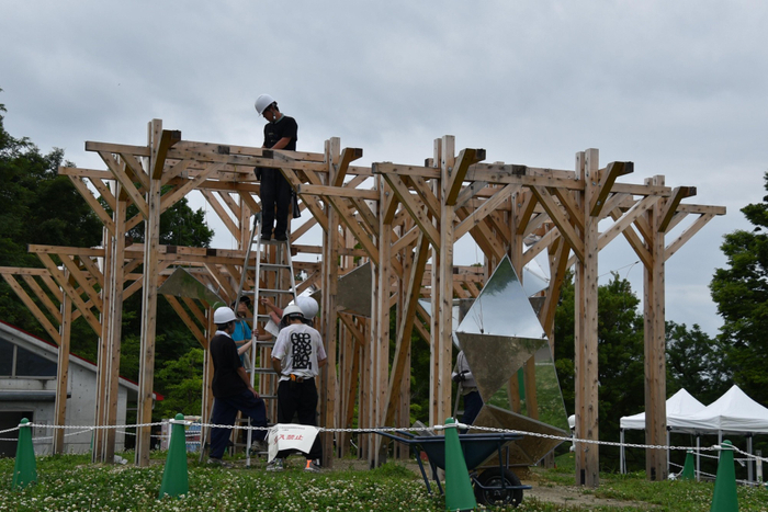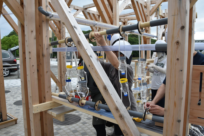 生田研究室は学部生と院生の計26人、佐藤研究室は修士2年の4人、谷田研究室も修士2年の3人が中心となって約1年をかけ、今回の作品の企画案の構成作りから設計、大学内での準備、現地での施行までを行い、完成にこぎつけました。学生や院生たちは「学生だけでの手で何かをつくりあげるのはありがたい経験でした」「失敗も多く、実験を重ねては作り変えるなど試行錯誤して大変でしたが、自由にできて楽しかったです」と手応えを話していました。