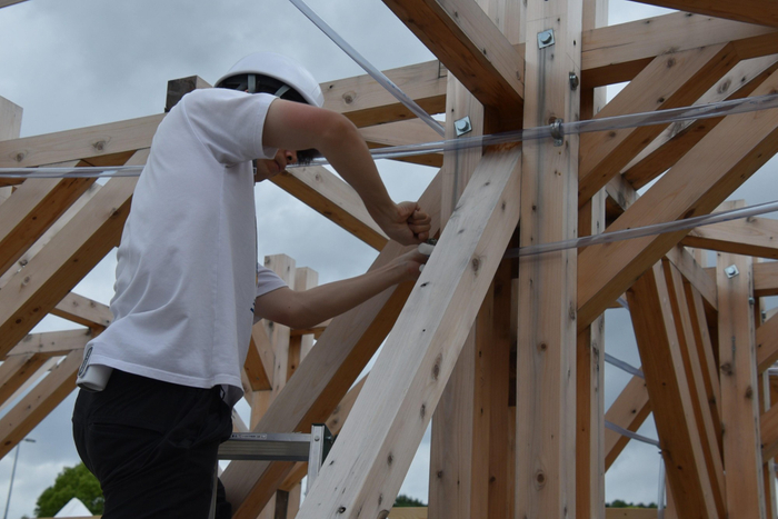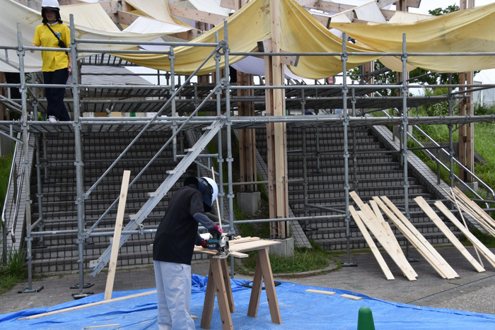 2005年の「愛・地球博」(愛知万博)開催から20周年を記念した愛知県主催の事業「愛・地球博20祭」の一環として企画され、会場となった愛知県長久手市の「愛・地球博記念公園」を特別感あふれる空間に演出するイベント「彩(いろどり)の回廊」に、本学理工学部建築学科の生田京子教授と谷田真准教授、佐藤布武准教授の研究室が参加し、構想から設計、制作まで約1年間をかけて制作した作品が6月28日(土)から7月20日(日)まで展示されます。6月26日には学生たちが最後の仕上げ作業に追われました。