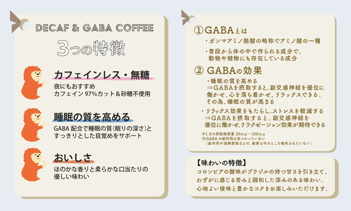 **コーヒーの味や香りを好んでいても、体質や体調などによってカフェイン摂取を制限する必要があり、カフェインレスコーヒーを選択するものの、味に不満がある(味、香りが薄い、コクが感じられないなど)方が多い。また、おやすみ前にコーヒーでリラックスしたいけれどカフェインは摂取せずに、リラックスして深い眠りについてスッキリ目覚めたい。それらの声に応える商品として「GABA配合のコーヒー(機能性表示食品)」を開発いたしました。**