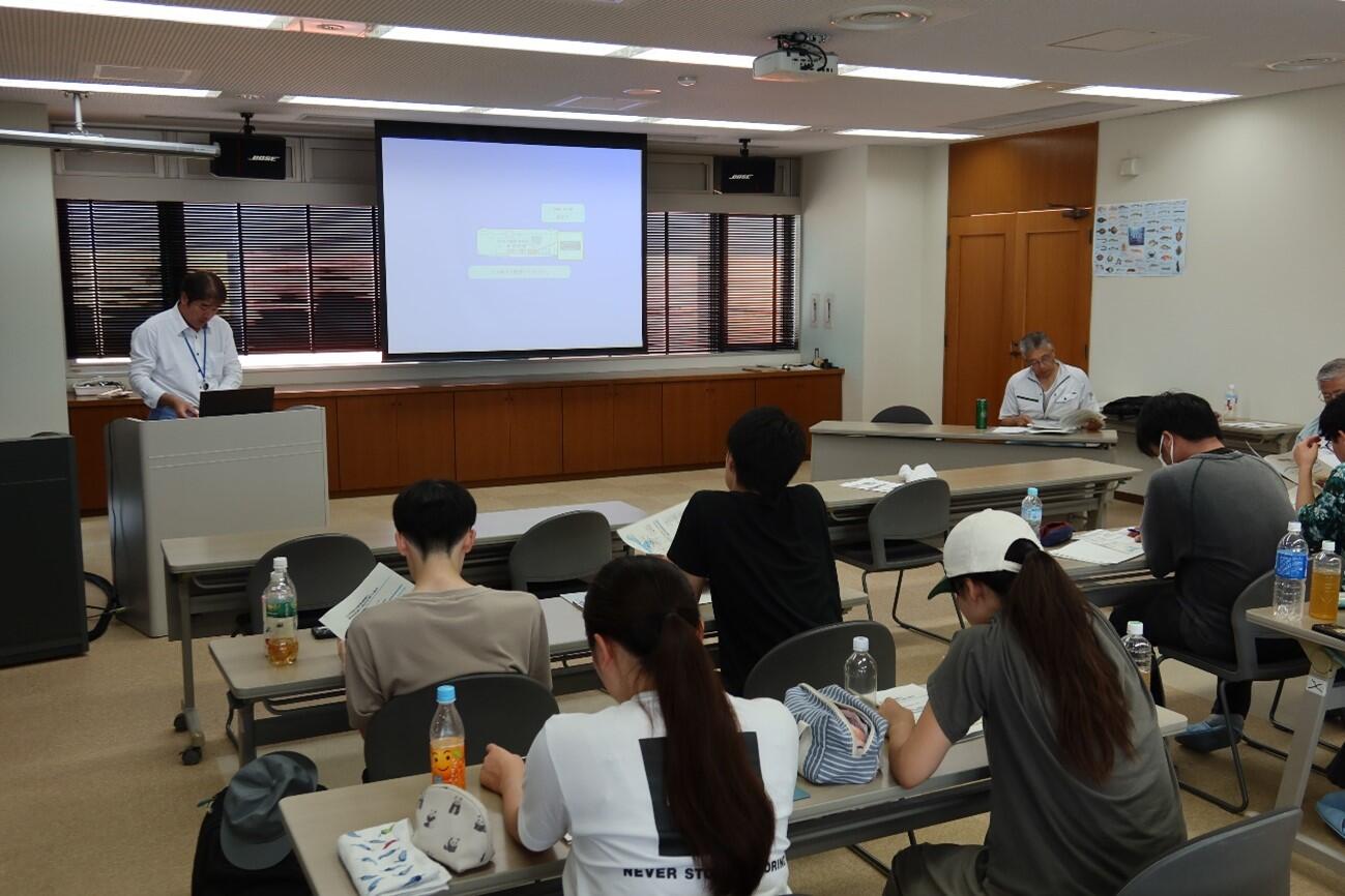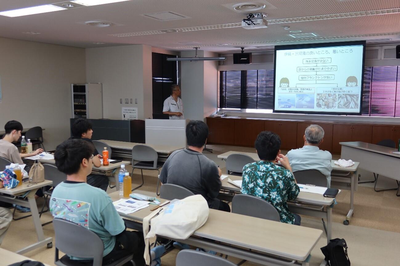 水産試験場の漁場環境研究部・中嶋康生部長から「伊勢・三河湾の漁場環境」と題して話題提供がありました。そこでは環境調査で収集したデータをもとに三河湾の現状を知り、現在どのような取り組みが行われているかを考えました。また、国土交通省三河港湾事務所の松永洋明課長からは「三河湾の環境課題と環境改善に向けた取り組み」と題して三河湾の環境改善に向けた取り組み状況の説明がありました。