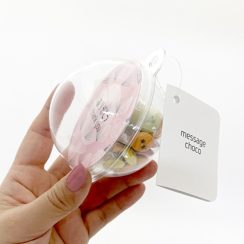 可愛らしいクリアな球体入りのプチギフトは、ちょっとしたお礼やお誕生日プレゼント、バレンタイン、卒業記念のプチギフトに最適です。直径約80mmの透明ボールパックに収められたチョコは、約50gとお手頃な量で、メッセージは約半量にプリントされています。パッケージされるチョコの色はランダムになります。