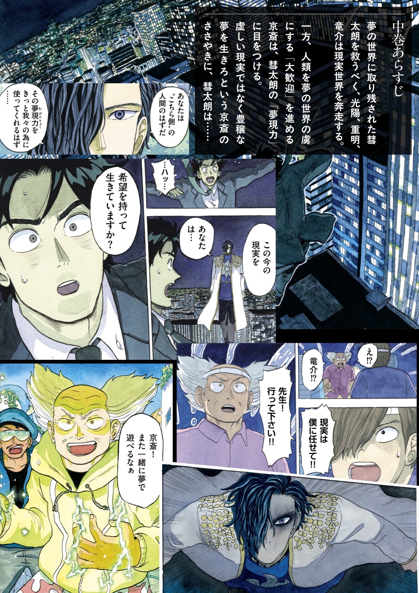 夢の世界に取り残された彗太朗を救うべく、光陽、重明、竜介は現実世界を奔走する。一方、人類を夢の世界の虜(ルビ「とりこ」)にする「大歓迎」を進める京斎は、彗太朗の「夢現力」に目をつける。虚しい現実ではなく豊穣な夢を生きろという京斎のささやきに、彗太朗は……