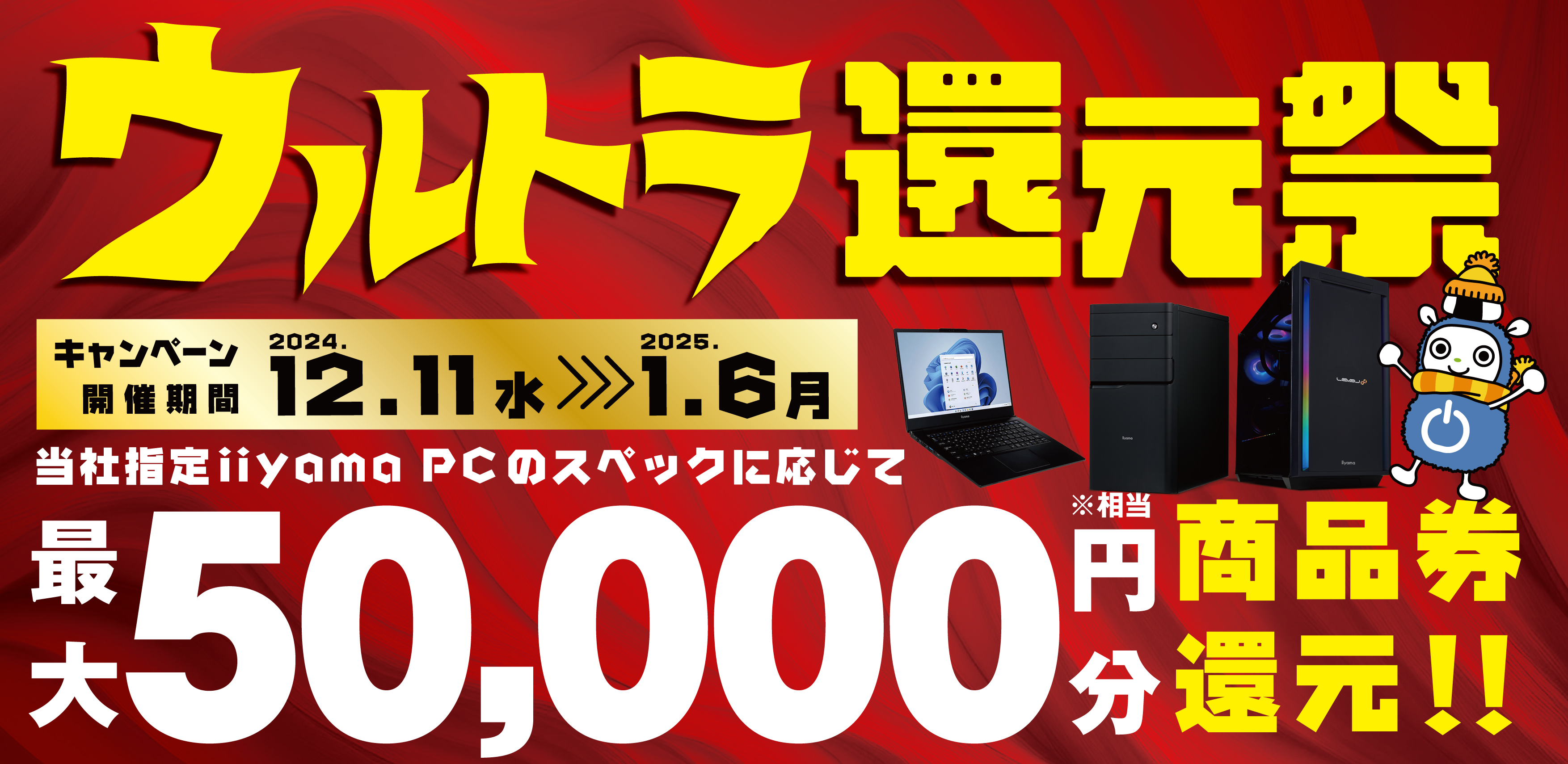 全国のパソコン工房店舗では、対象の新品パソコン・ゲーミングPCをご購入いただくことで、指定機種のスペックに応じて最大5万円分相当※の還元が付与されるパソコン工房会員様限定のキャンペーン「ウルトラ還元祭」を期間限定で開催中です。