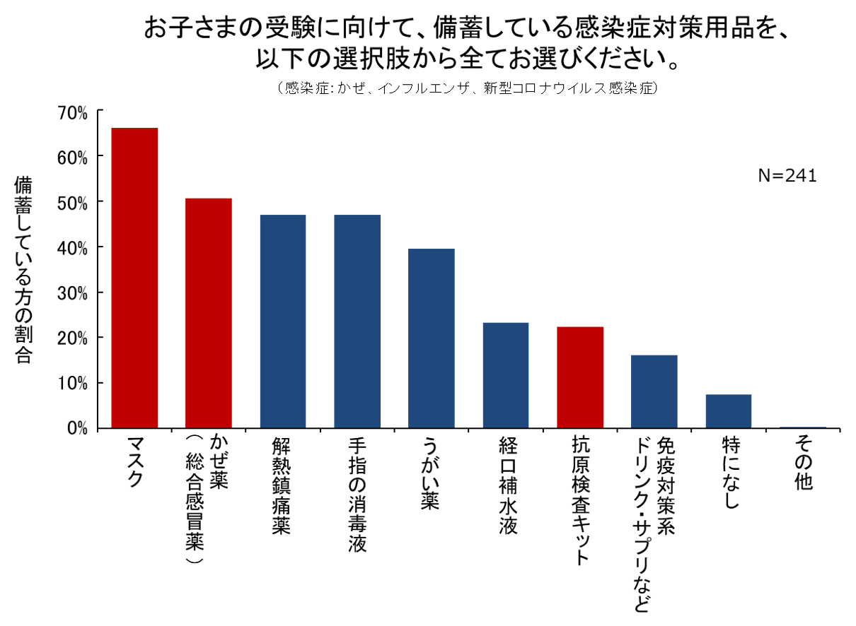 また、今回の調査では受験に向けた感染症対策として「マスク」や「かぜ薬(総合感冒薬)」を常備しているご家庭が半数を超えました。さらに、抗原検査キットも、約2割のご家庭で常備していることが分かりました。一般用の抗原検査キットは、2022年から薬局やインターネット等で購入できるようになったこともあり、ご家庭によっては感染症対策の選択肢の1つとして取り入れられているようです。