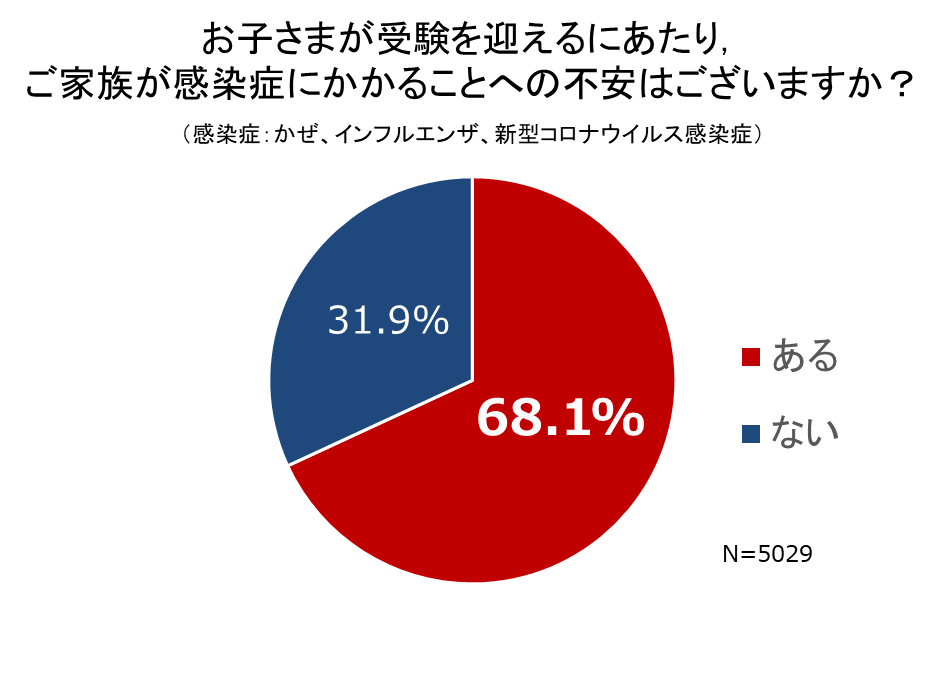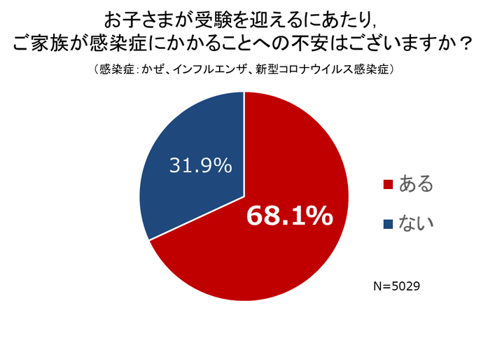 いよいよ受験シーズンを目前に控え、かぜやインフルエンザ、新型コロナウイルス感染症などの感染症が気になる時期になりました。この度、大正製薬が実施した調査では、この冬に中学・高校・大学受験を控えたお子さまがご家庭にいる方(5029人)のうち、約7割の方が「ご家族が感染症にかかることに不安がある」と回答しました。