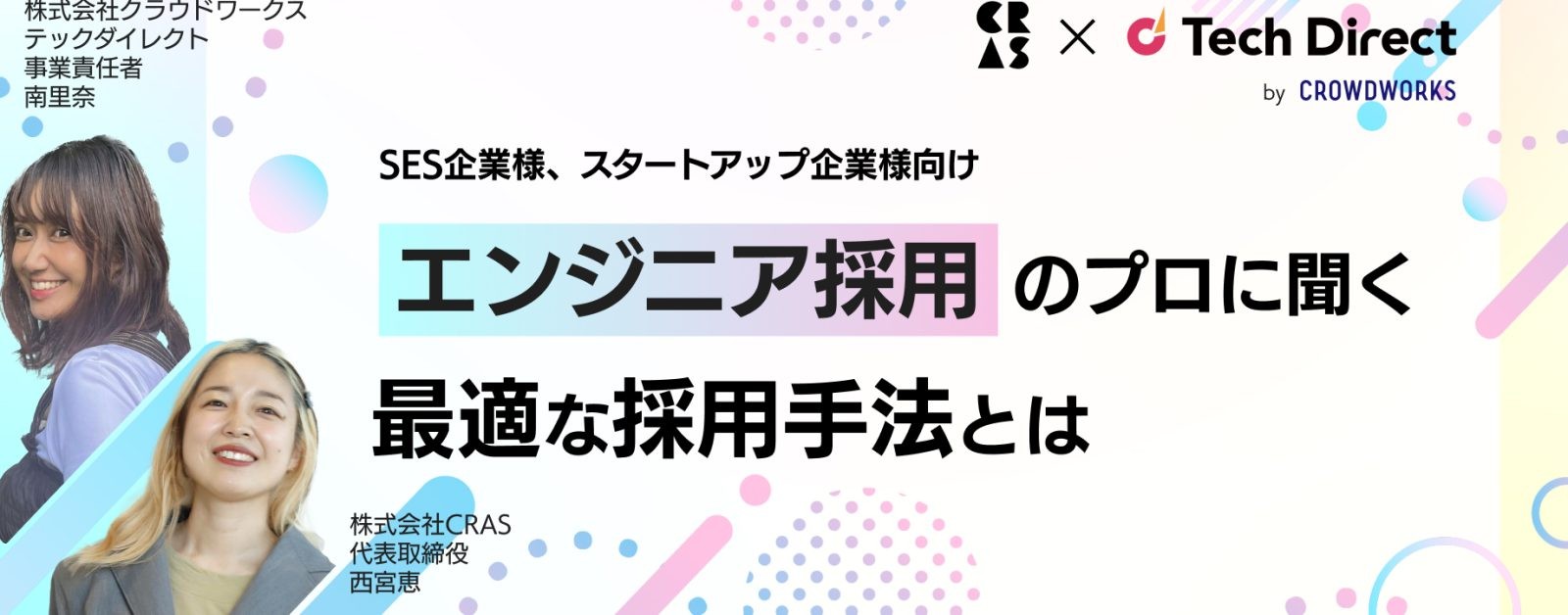 株式会社クラウドワークス(本社:東京都渋谷区 代表取締役社長 兼 CEO:吉田 浩一郎、以下当社)が運営するハイスキルIT人材マッチングサービス「テックダイレクト」は、株式会社CRAS(所在地:東京都渋谷区 代表取締役: 西宮 恵)の西宮代表をお招きし、SES・スタートアップ企業向けの最適な採用方法の解説動画を7月25日(金)に公開しました。