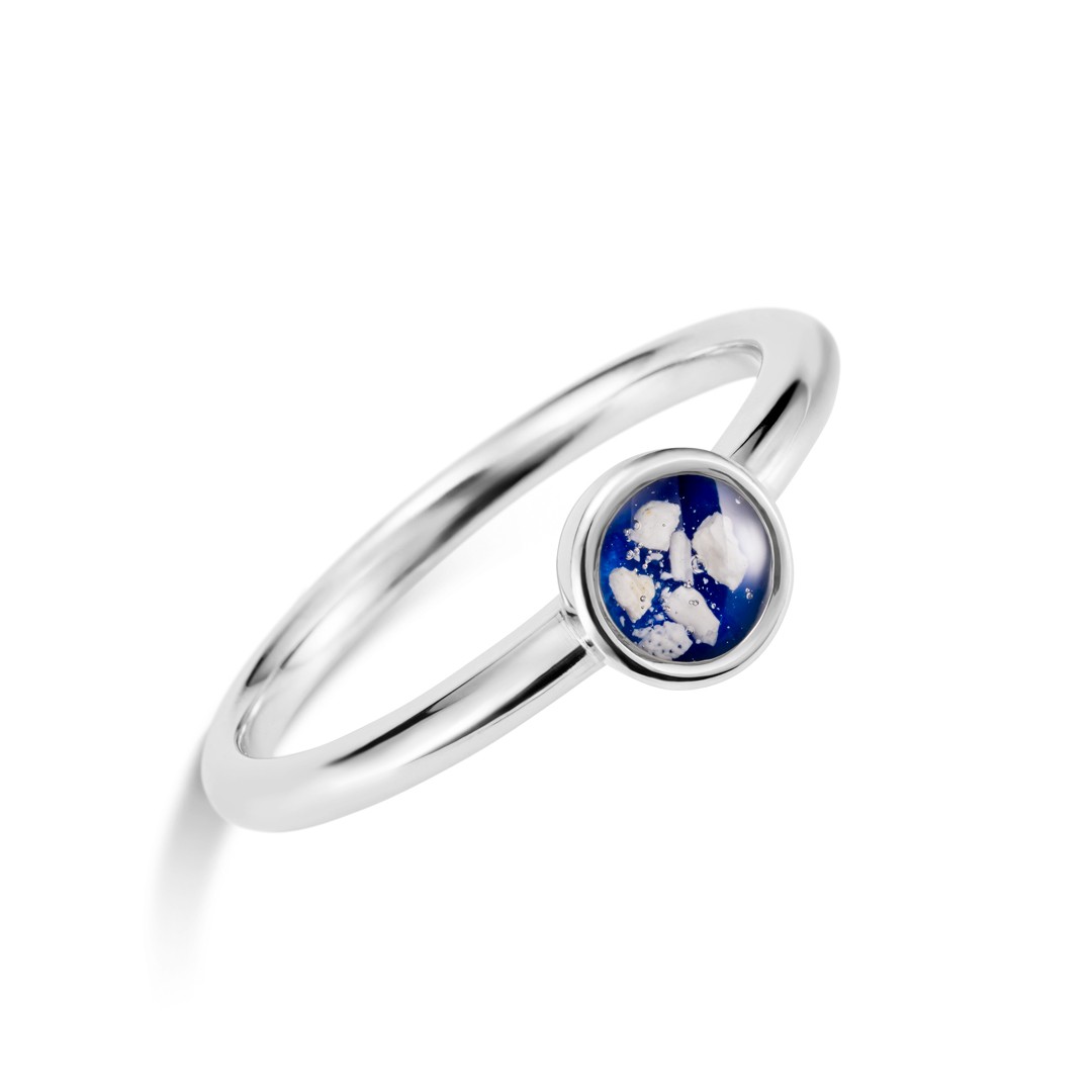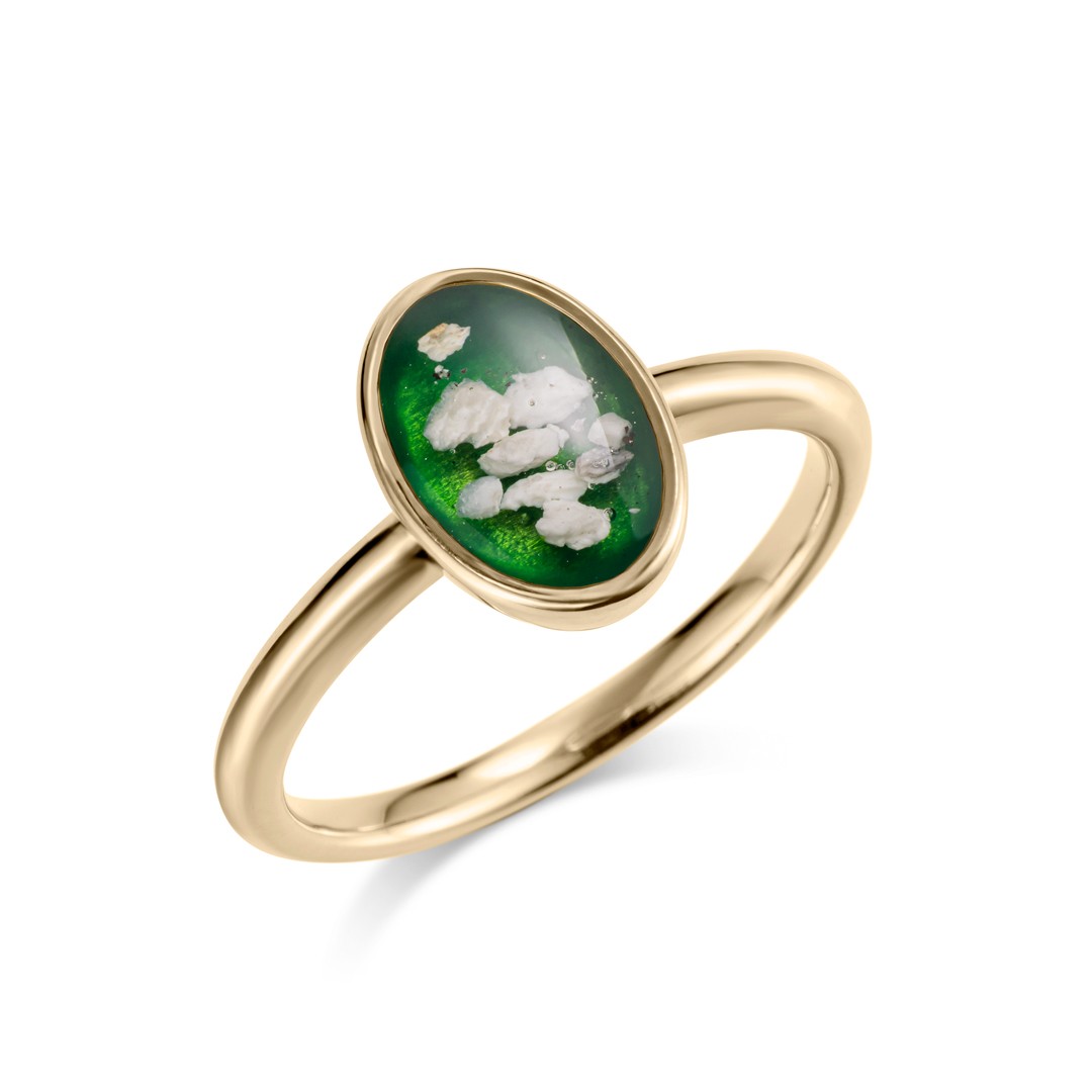 『オーバル』と『ラウンド』は納めたものをリング正面に配置し、視覚的にも大切な存在を感じられるデザインです。樹脂カラーは自由に選ぶことができ、「ペットの瞳の色」「好きだったおもちゃの色」「いつも身につけていた首輪の色」など、想い出を色として残すことができます。いずれも名前や没年月日などの刻印にも対応します。