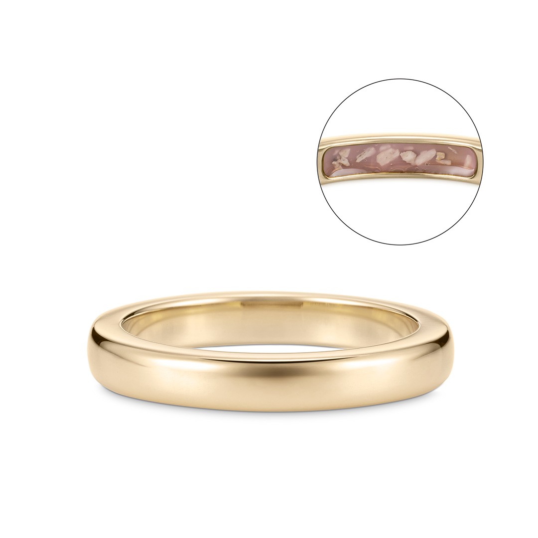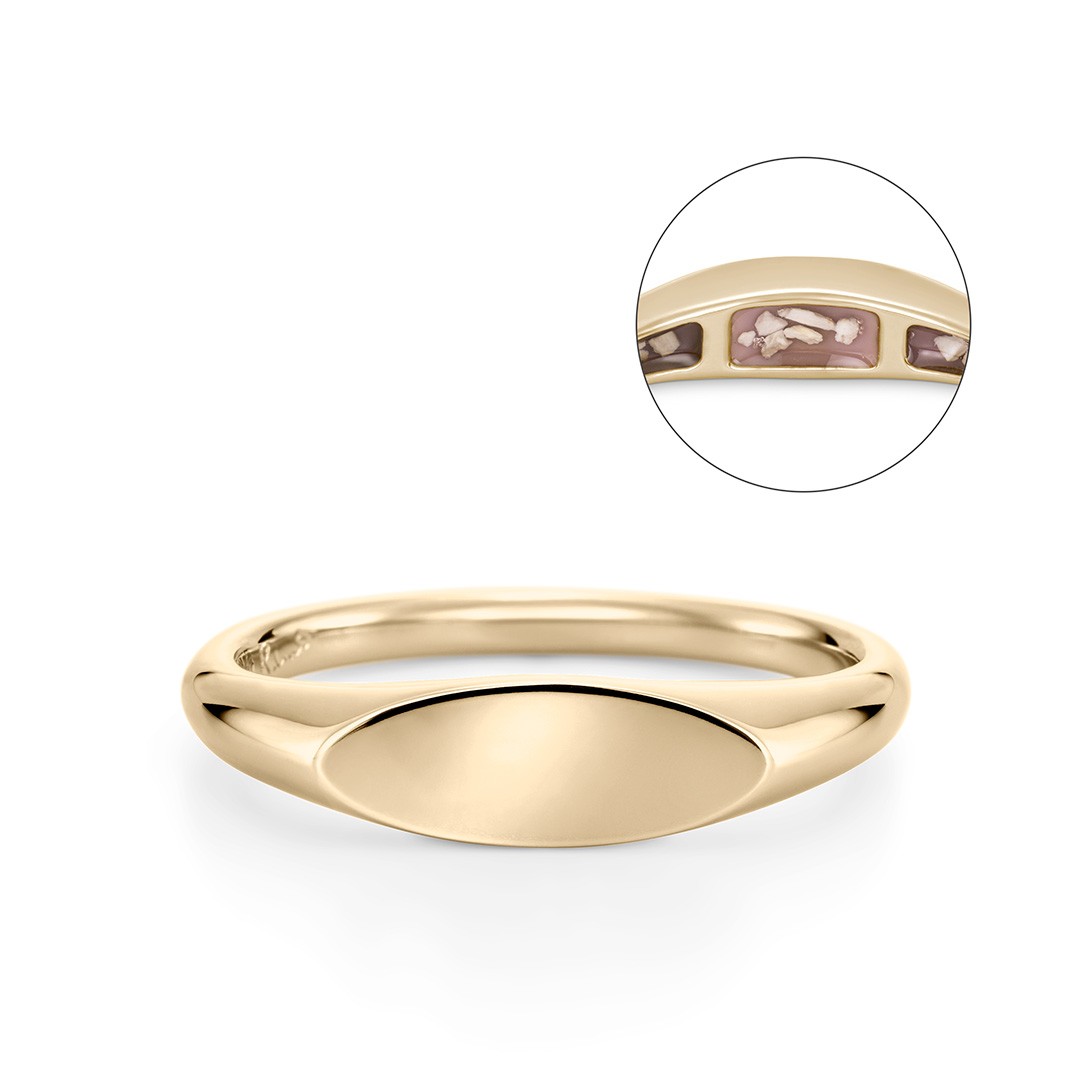 『シグネット』と『プレーン』は内側に封入するタイプです。肌に触れる部分に納めることで“そばにいる”という感覚を感じていただけます。一見すると通常のジュエリーで、人目を気にせず絆を感じられるのもポイントです。表面には宝石やイニシャル、彫り模様を追加するなど自由にアレンジができます。