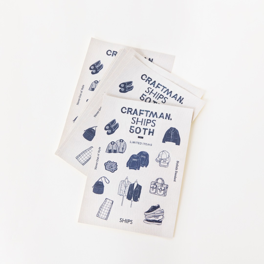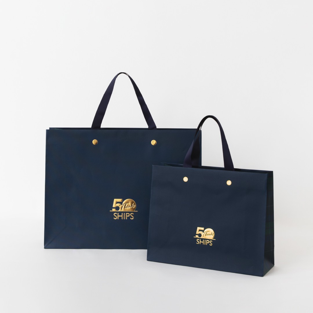 コーポレートカラーの「ネイビー」と、設立50年の節目に誕生したハウスタータン「SHIPS」を組み合わせた、50周年のためだけの特別なデザインです。節目の年を彩る、今だけしか手に入らない限定ショッパーをぜひお楽しみください。