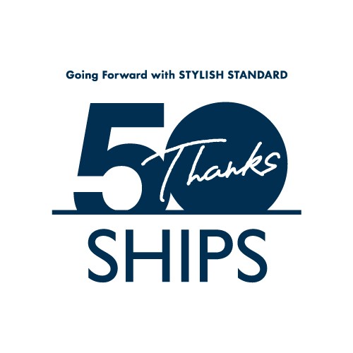 「海」「船」「航海」というシップスを象徴するキーワードを基にデザインされた記念ロゴには、これまでの50年間で培ってきた価値と未来への決意が込められています。「50」の下に配された水平線のラインは、これまでの軌跡と未来に向けて未知なる海へ航海を続ける姿を表しています。また、「最高の普通」を体現するベーシックな書体を採用し、時代を超えて愛される普遍性と親しみやすさを表現しました。「Thanks」のメッセージには、お客様や取引先様をはじめとする、シップスを支えてくださった皆様への感謝の想いを込めました。
