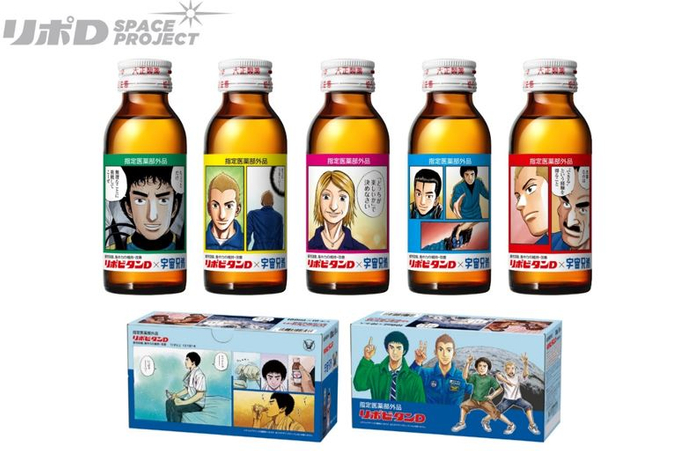 “リポビタンD 宇宙兄弟ボトル 第2弾”は、「宇宙兄弟」に登場する主人公たちの名言・名シーンをモチーフにしたラベルを貼った5種類のデザインボトルで、外箱(10本箱)は、小山宙哉氏によるリポビタンD×宇宙兄弟の描き下ろし画となっています。