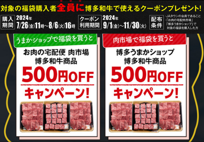 このキャンペーンでは、博多和牛の消費拡大を目的として、7月26日(金)11時~8月6日(火)16時の期間中に「お肉の宅配 肉市場」で対象の福袋を購入した方全員へ、後日「博多うまかショップ」にて販売する博多和牛商品で使用できる500円OFFクーポンをプレゼントします。