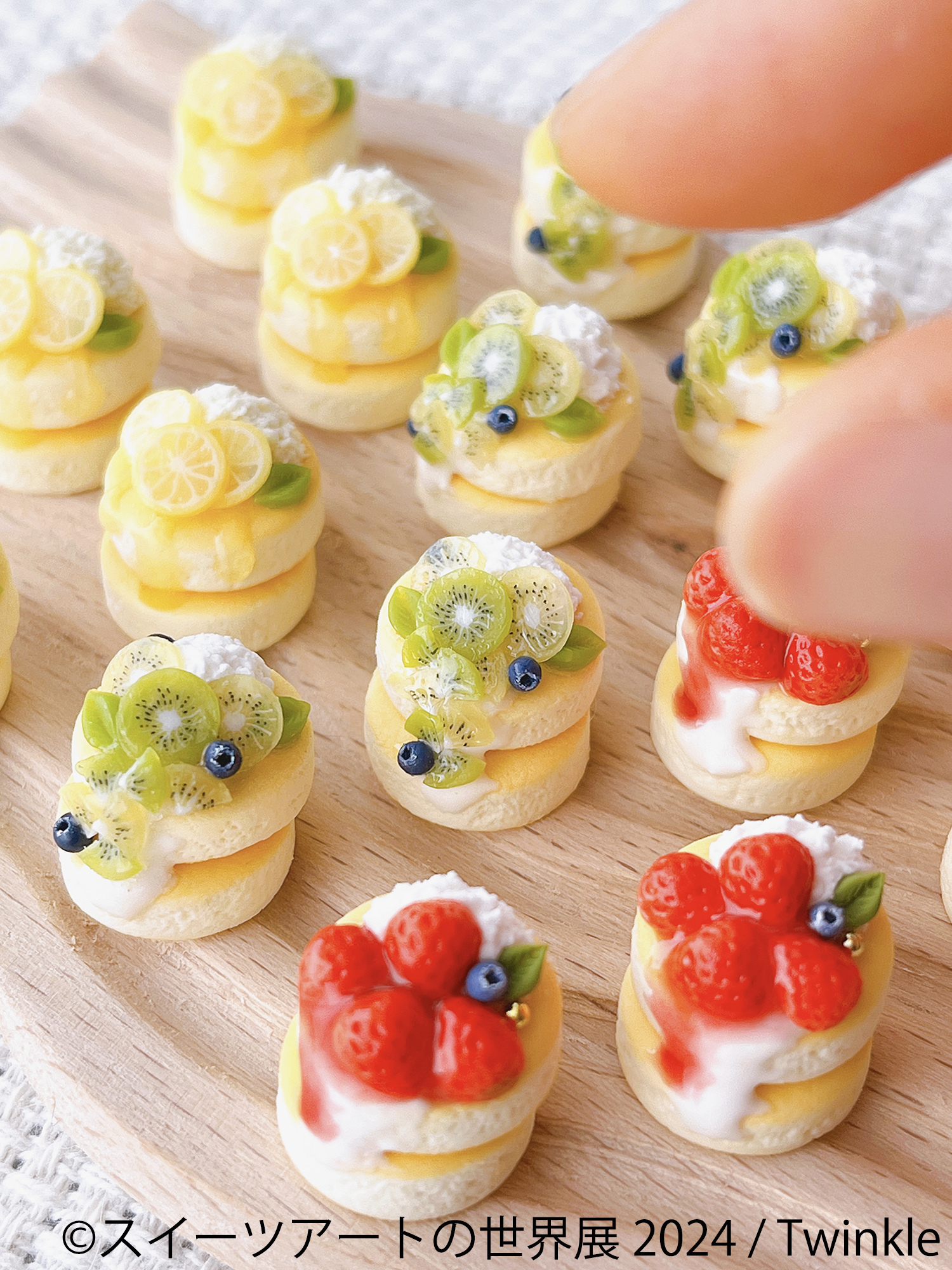 本展では、XやInstagramなどSNSでフェイクスイーツ作品を公開するクリエイター37組が大集結!なかでも注目は、Instagramでフォロワー数が1.4万人を超える「nominn(@nominn_nh)」やメインビジュアル作品を担当する「Mi・mi※(@mimi_fakesweets)」らが新作を披露するほか、「Jun(@jun_kone)」のほっこりイチゴのケーキ屋さんや、「プリマトルテ -クレイ洋菓子店-(@primatorte)」の高さ約30cmのマカロンタワーの立体作品も初展示いたします!